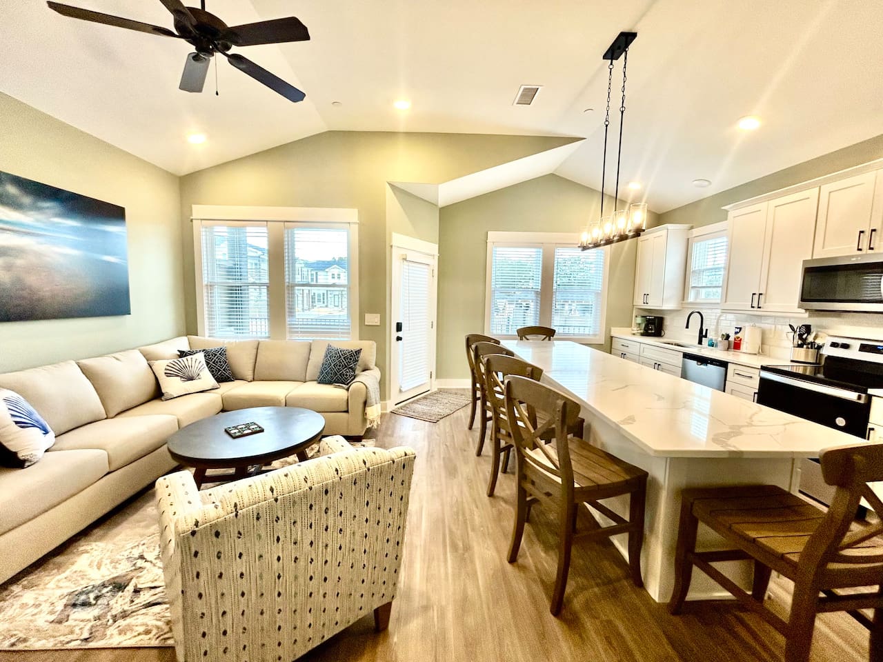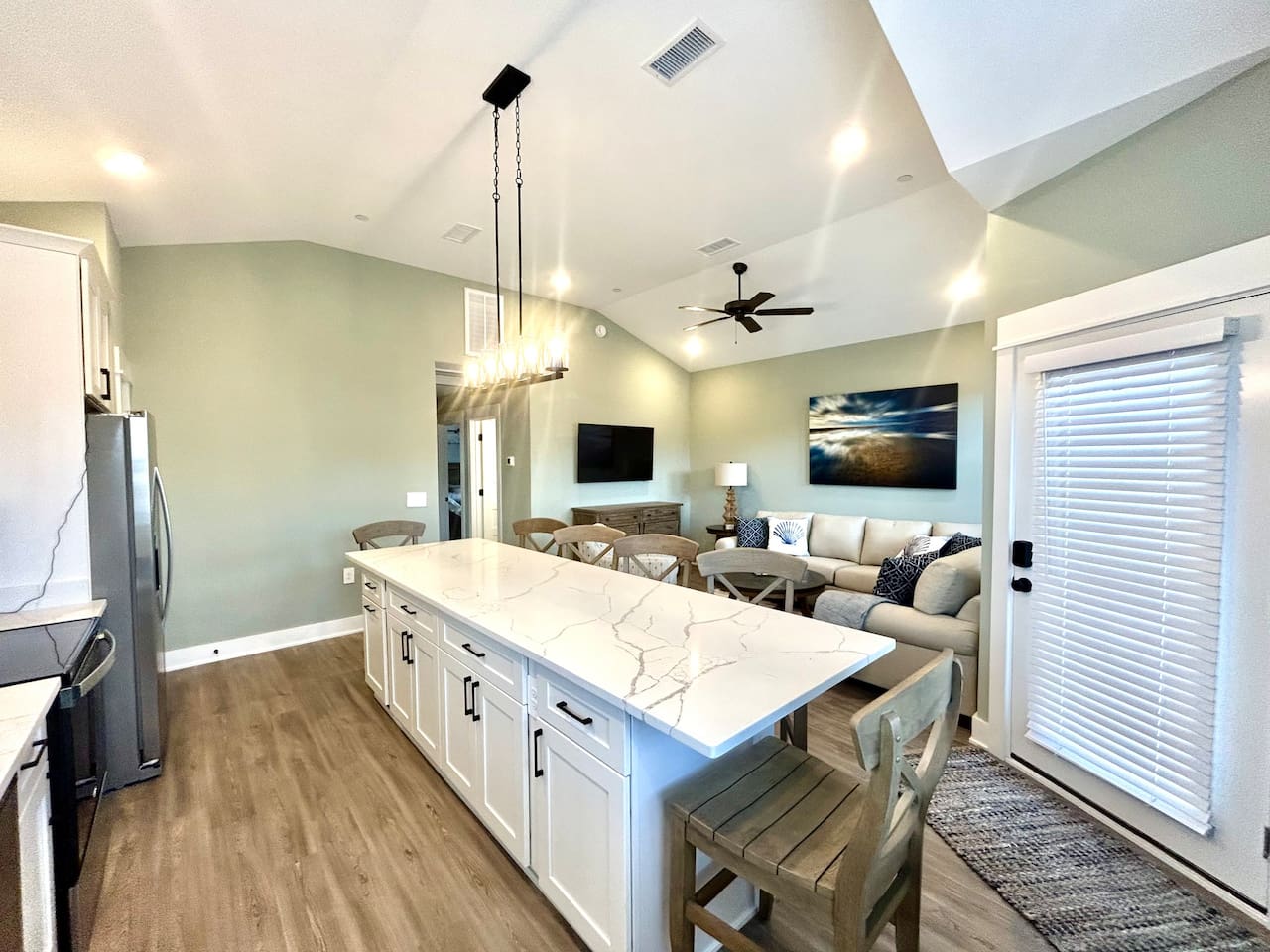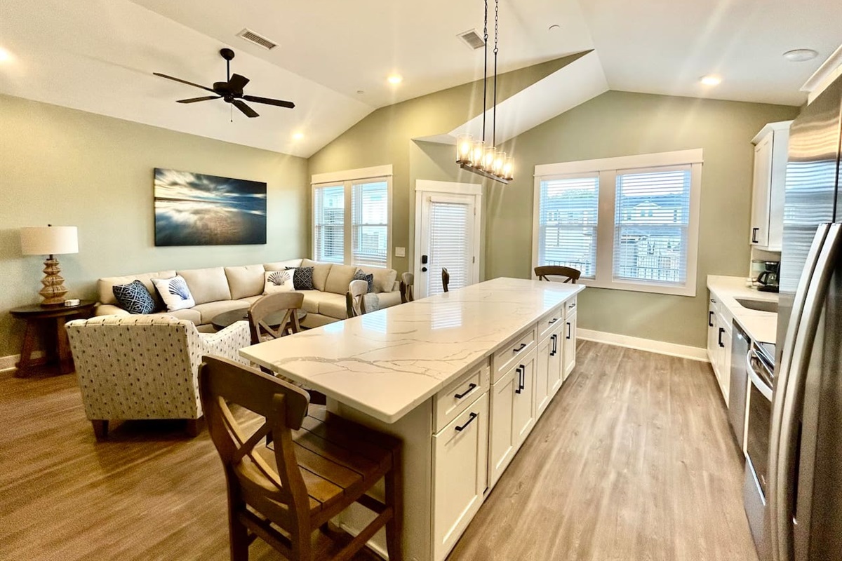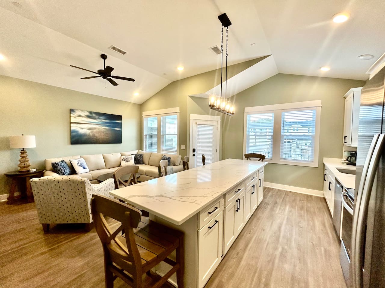 The open concept kitchen boasts a 10 foot counter with enough seating for your group to gather, prepare meals, play games and make memories.