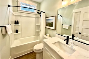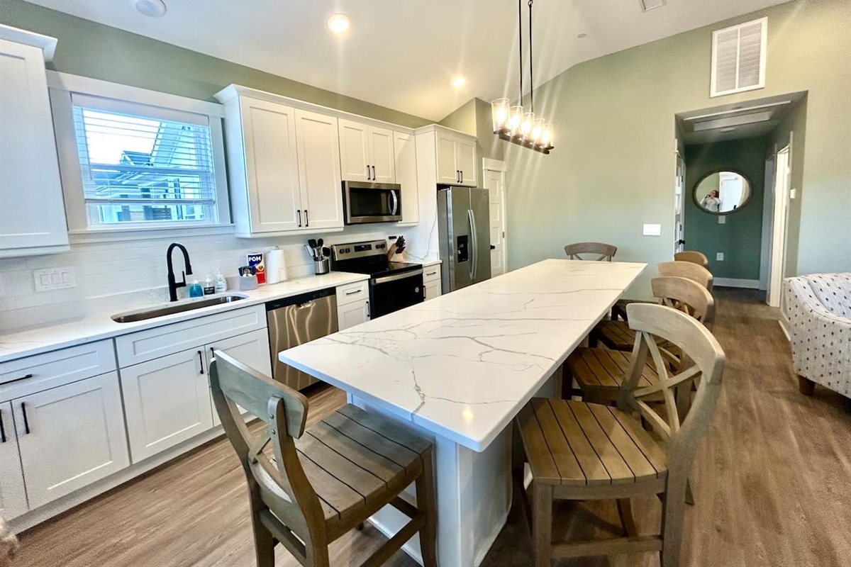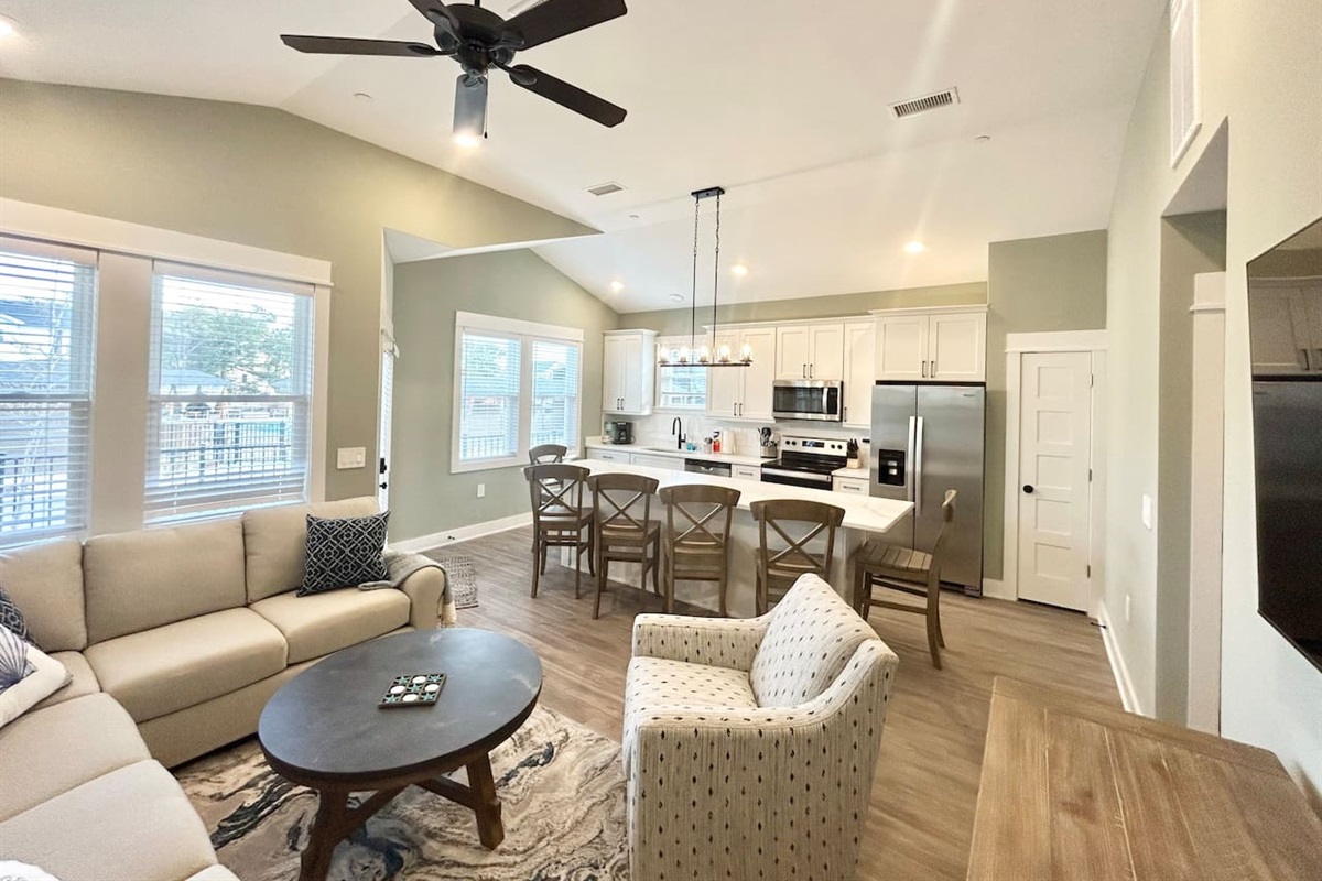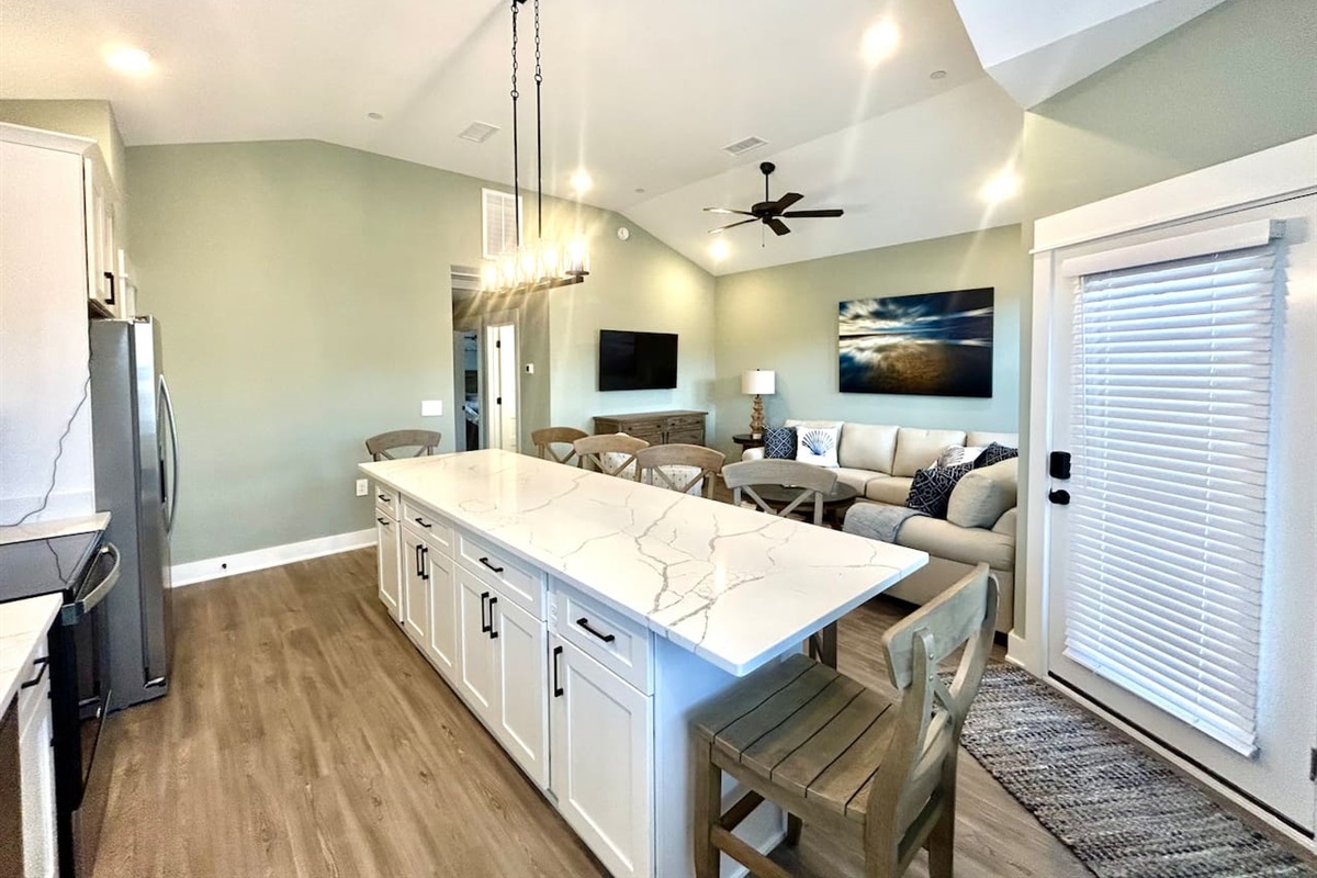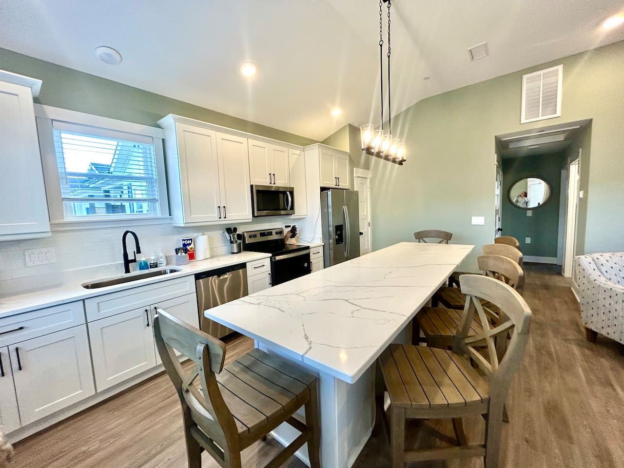 The open concept kitchen boasts a 10 foot counter with enough seating for your group to gather, prepare meals, play games and make memories.